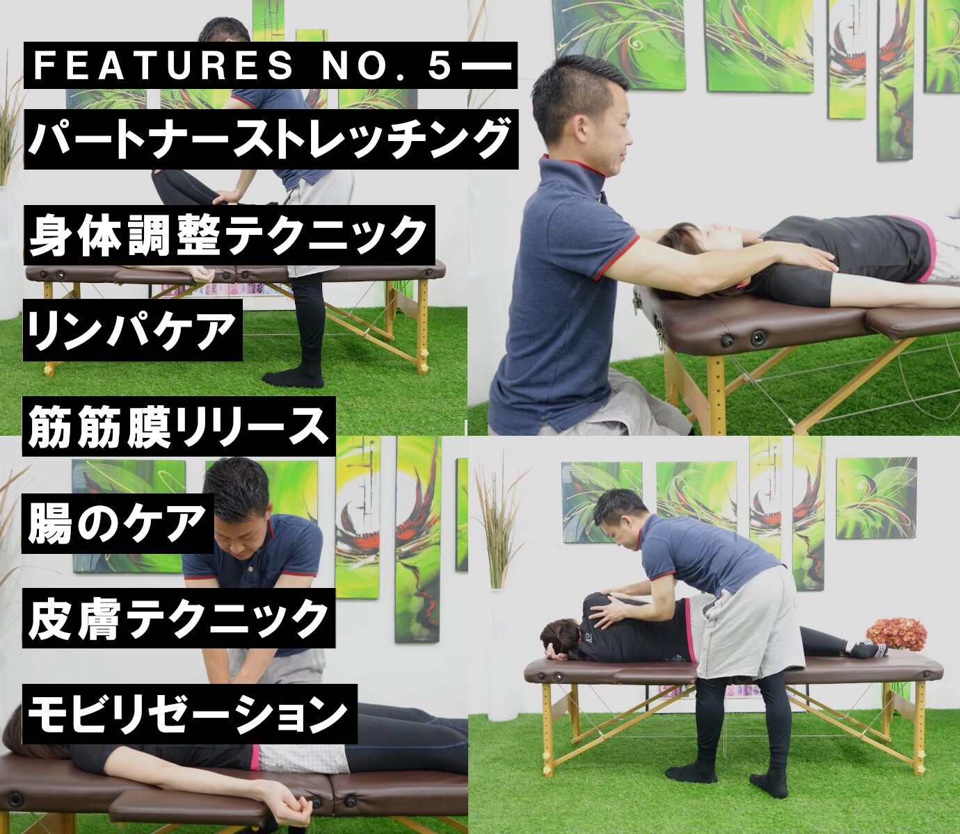 さまざまなお悩みに対応するために、あらゆるテクニックを駆使。「リンパケア」「身体調整」「筋膜リリース」「ストレッチング」「姿勢改善」など、個人の身体の状態に合わせて使い分け、自然体へと導きます。