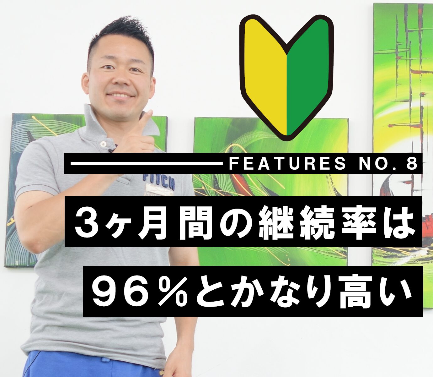 きついことだけでは継続しづらい。IZURUでは、毎回の変化を実感でき、かつ心地良い刺激で変われる。だからこそ、筋トレ初心者の方でも続く。3ヶ月間の継続率は、96%と非常に高い。続けやすいのもIZURUの特徴です。
