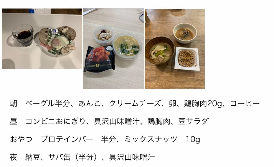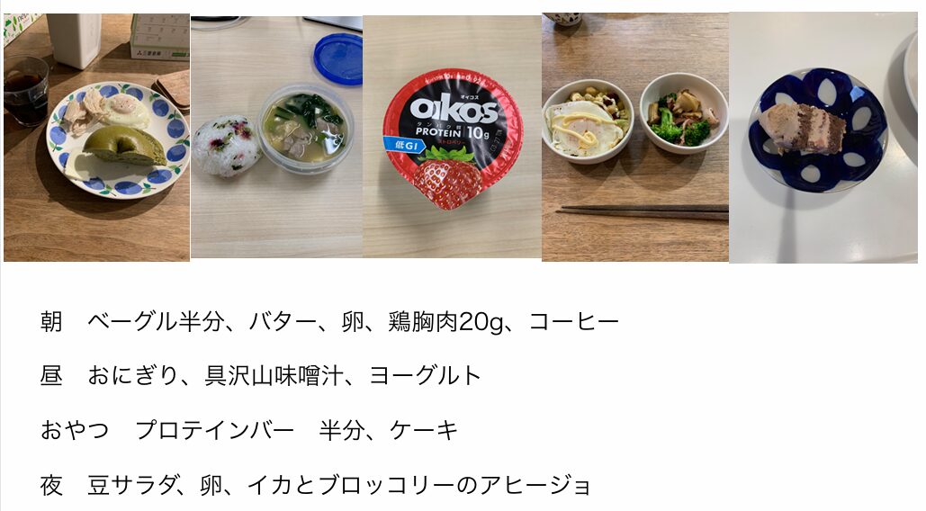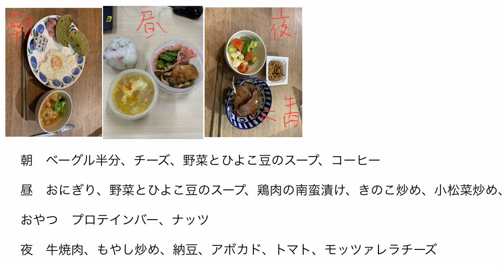 忙しすぎると食べ過ぎたり、逆に全く食べないこともありました。ですので、食事のバランスを気をつけるようにアドバイス。実際にアドバイスして摂られていた食事は、以下の通り。