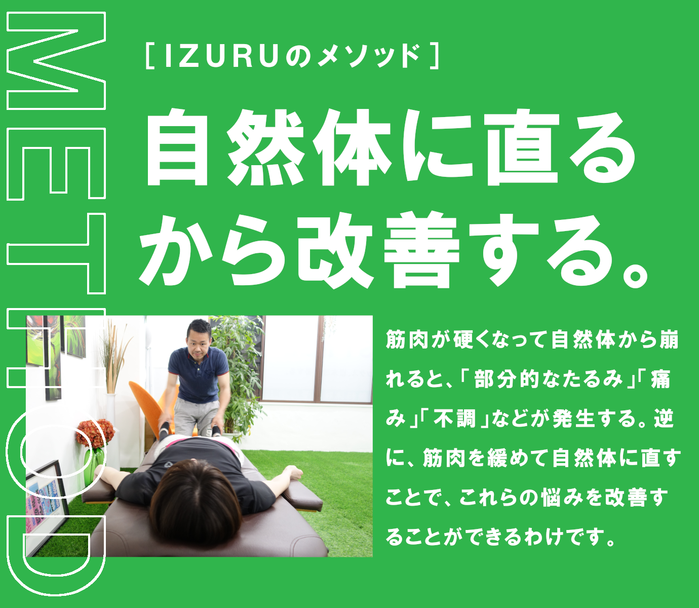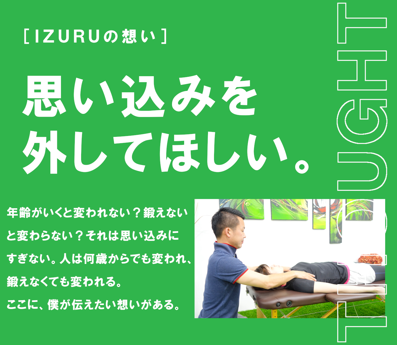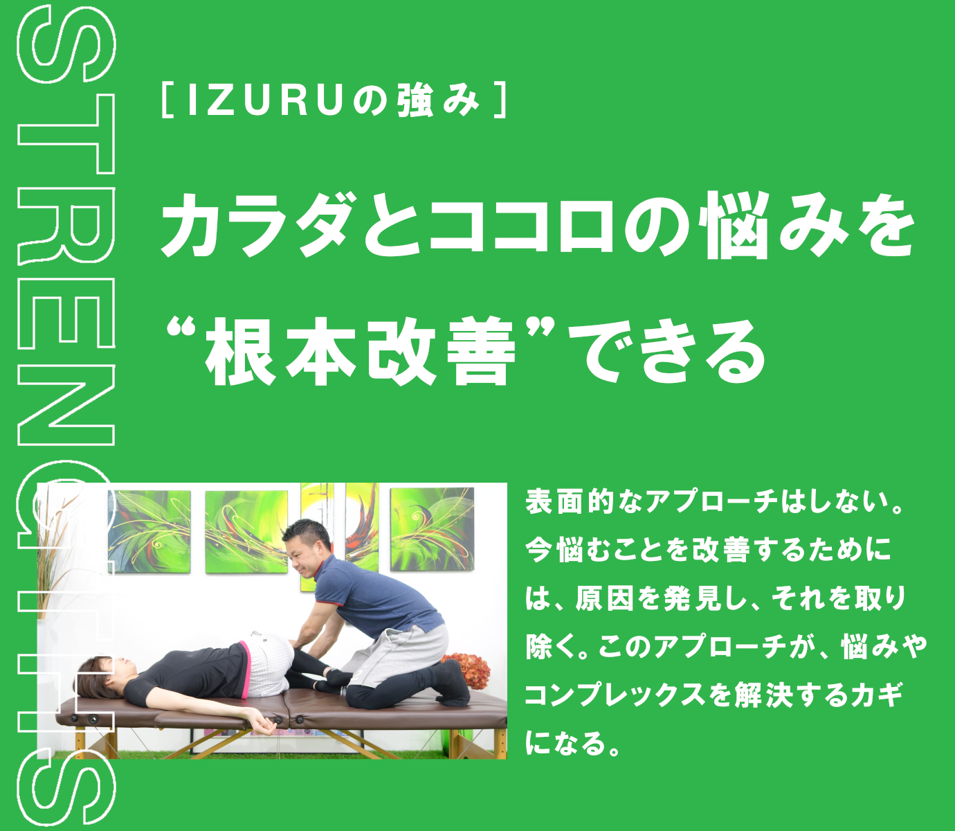IZURUの強みは、悩みの根本改善ができるところ。病院やジムなど、どこへ行っても改善しなかったことでも改善可能です。ではなぜ、IZURUで根本改善することができるのでしょうか?