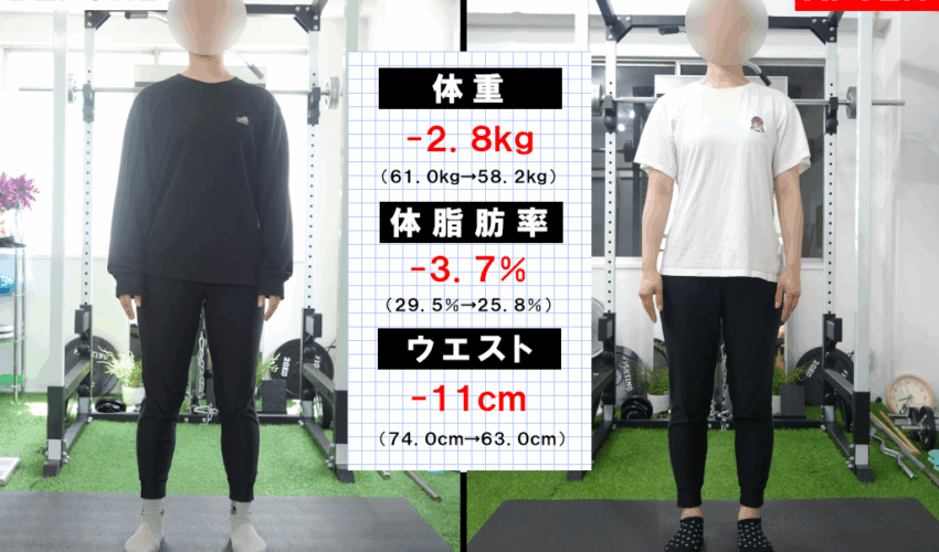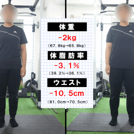 性格も真面目で一生懸命メニューに取り組んでいただけるので、その分結果も出てこちらとしても嬉しい限りでした。今後もセッションは続いていくので、より変化できるようにサポートしたいと思います。改めてパーソナルコースの成果をまとめると、以下の通り。