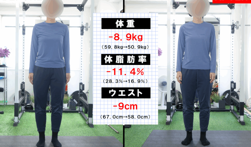 まいこさんは現在もパーソナルトレーニングを続けており、これからも長く続けられるそうです。改めてモニター期間の成果をまとめると、以下の通り。